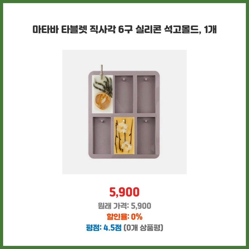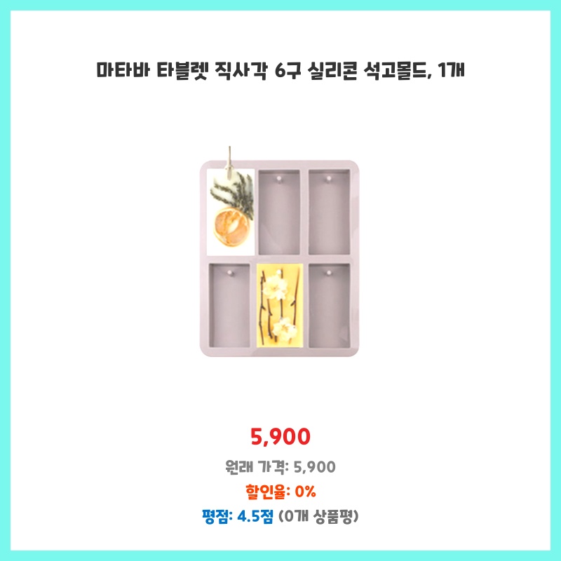 깔끔한 직사각형 디자인과 6구라는 실용적인 크기가 마음에 들어 구매했습니다. 실리콘 소재라 석고 탈형이 용이하고, 여러 개의 초콜릿이나 비누를 동시에 만들 수 있어 효율적입니다. 세척도 간편하다는 점도 장점입니다.