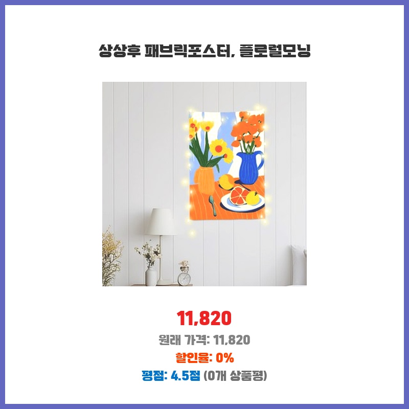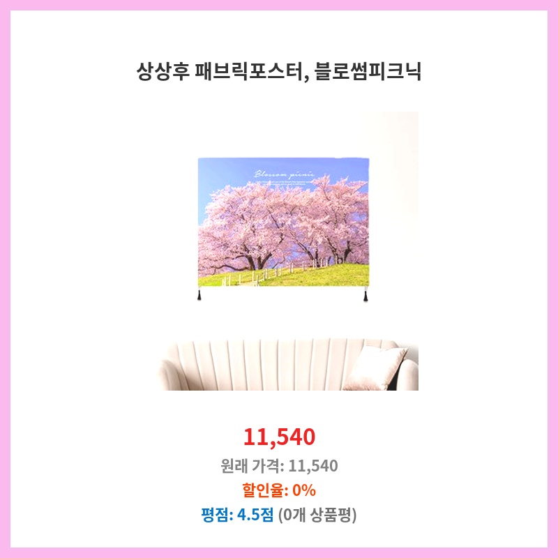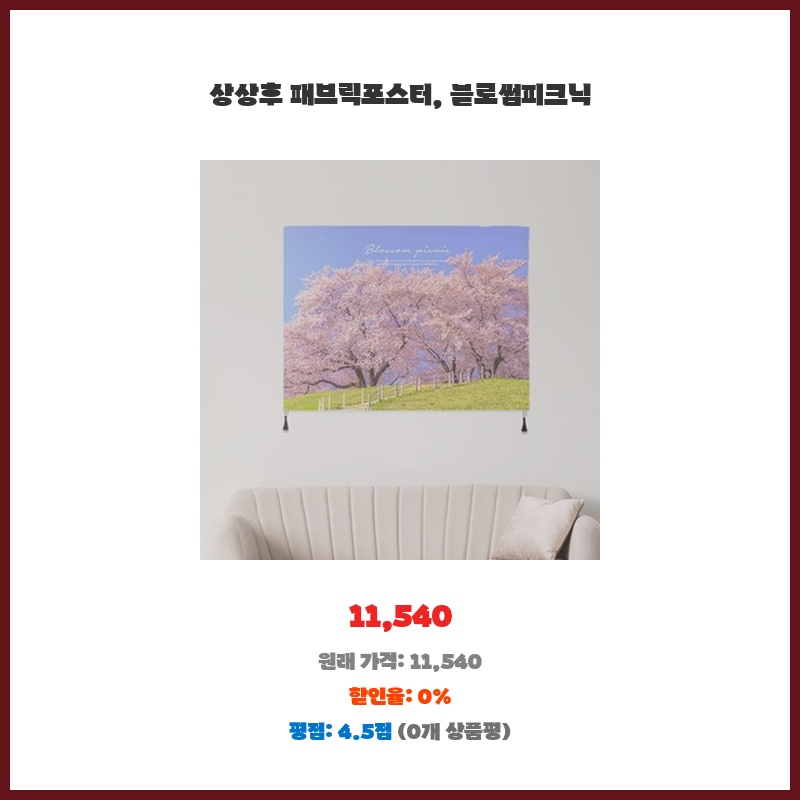 봄 분위기 가득한 예쁜 디자인에 끌려 구매했습니다. 패브릭 소재라 액자 없이도 걸 수 있고, 벽에 부담 없이 장식할 수 있어 좋았습니다. 가격도 적당한 편이었습니다.
