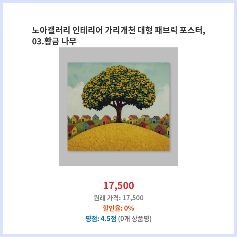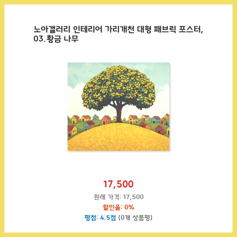 밋밋한 벽면이 신경 쓰여 인테리어 소품을 찾던 중, 가격 대비 크기가 큰 대형 패브릭 포스터가 눈에 띄었습니다. 황금 나무 디자인이 은은하고 고급스러워 분위기 연출에 좋을 것 같아 구매했습니다. 재질도 괜찮아 보였습니다.