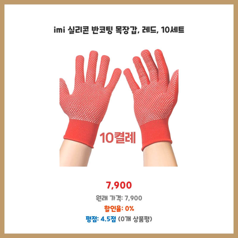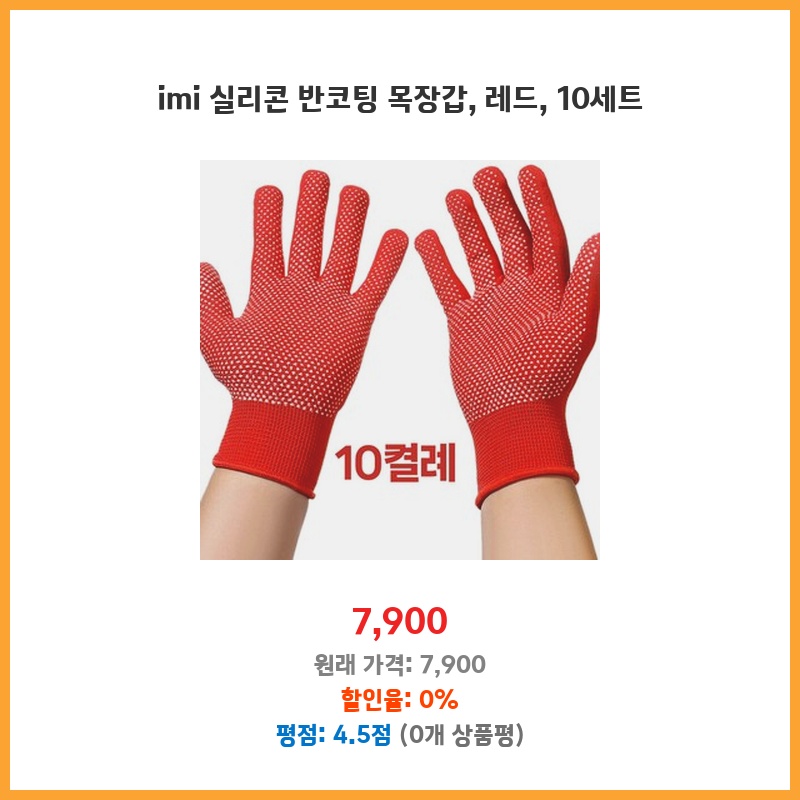 10세트에 7,900원이라는 저렴한 가격에 실리콘 코팅으로 내구성이 좋아 오래 쓸 수 있을 것 같아 구매했습니다. 빨간색이라 눈에 잘 띄는 것도 장점입니다. 목장갑이라 작업 시 편리할 것으로 예상됩니다.