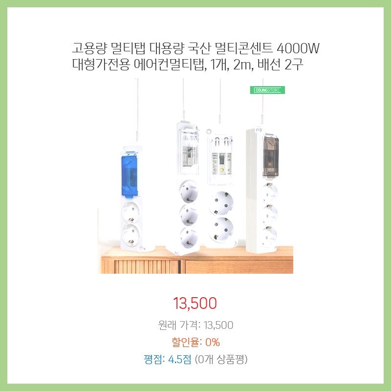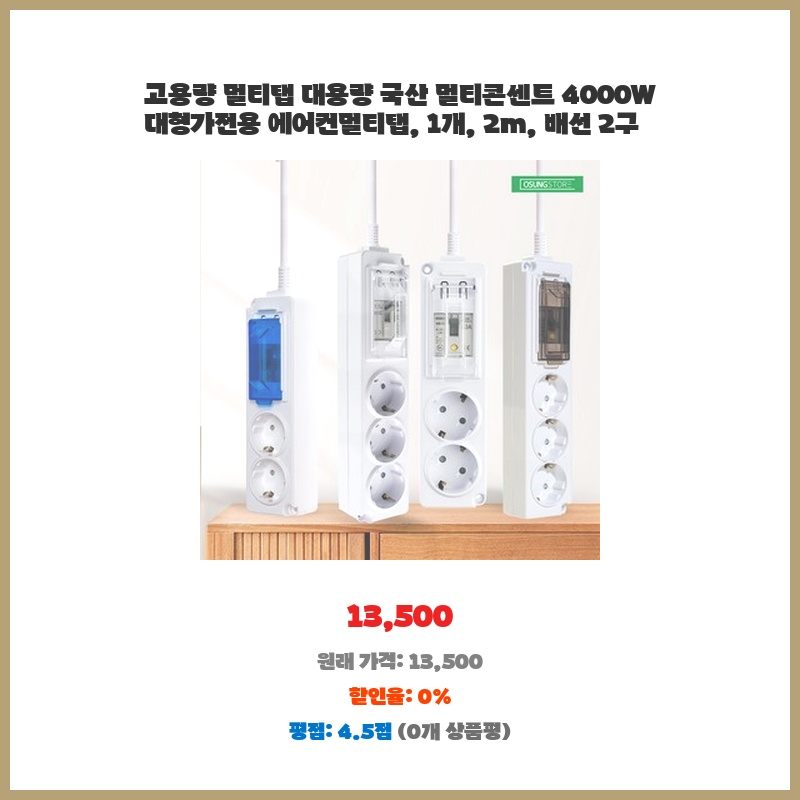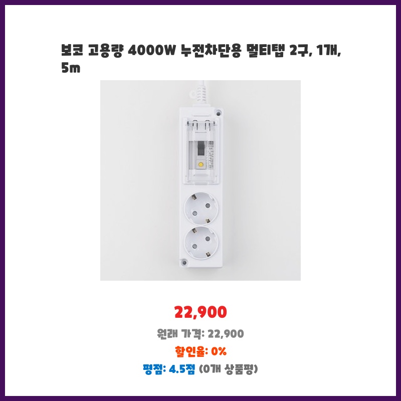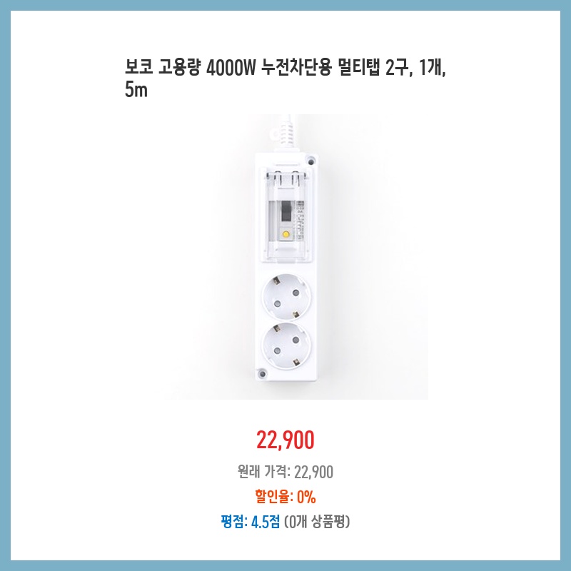 4000W 고용량에 5m 긴 코드까지, 여러 고출력 기기를 동시에 사용해야 하는 작업실 환경에 딱 맞는 제품이라 구매했습니다. 누전차단 기능도 안전에 대한 걱정을 덜어주어 만족스럽습니다. 2구라 공간도 효율적으로 사용할 수 있어 좋습니다.