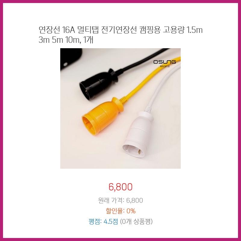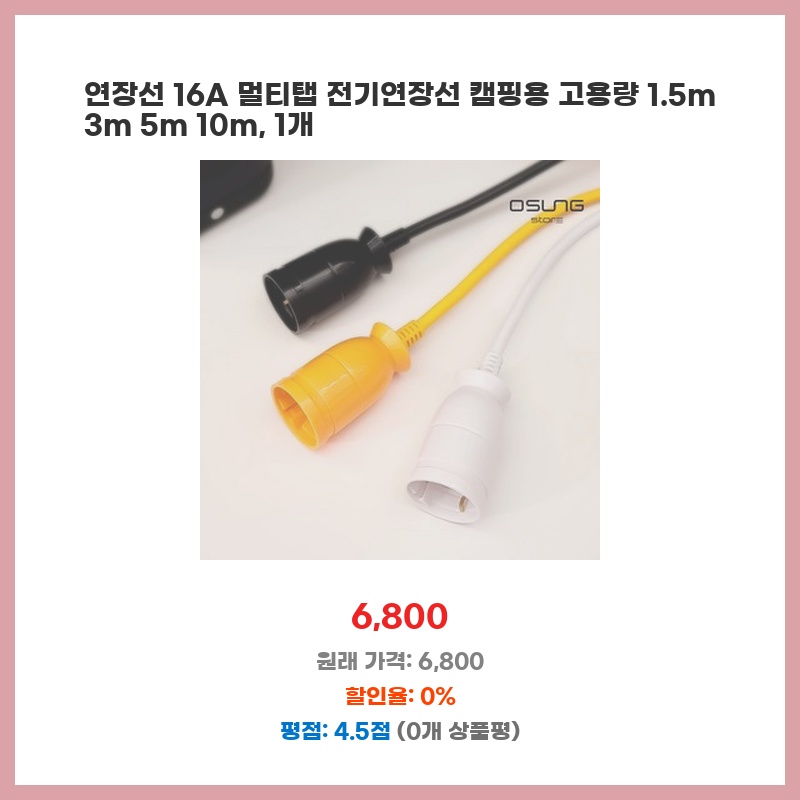 캠핑용으로 고용량 멀티탭이 필요했는데, 16A 고용량에 다양한 길이(1.5m, 3m, 5m, 10m) 선택이 가능해서 구매했습니다. 가격도 적당하고 휴대성도 좋아 보였습니다.