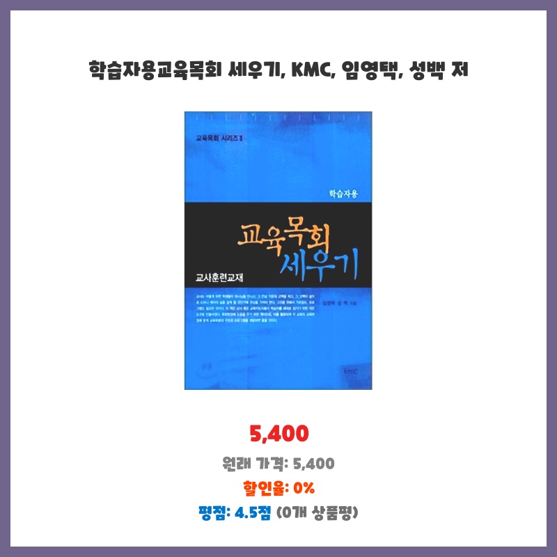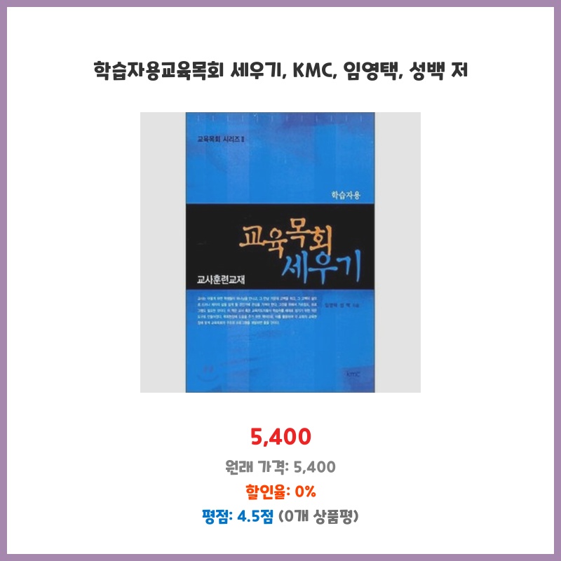 교육목회에 대한 체계적인 접근법을 배우고 싶어 구매했습니다. KMC 출판사의 신뢰도와 임영택, 성백 저자의 전문성에 기대하며 실제적인 교육 프로그램 구성 방법을 익히고자 합니다. 교재의 구성과 내용이 실무에 도움이 될 것으로 예상됩니다.