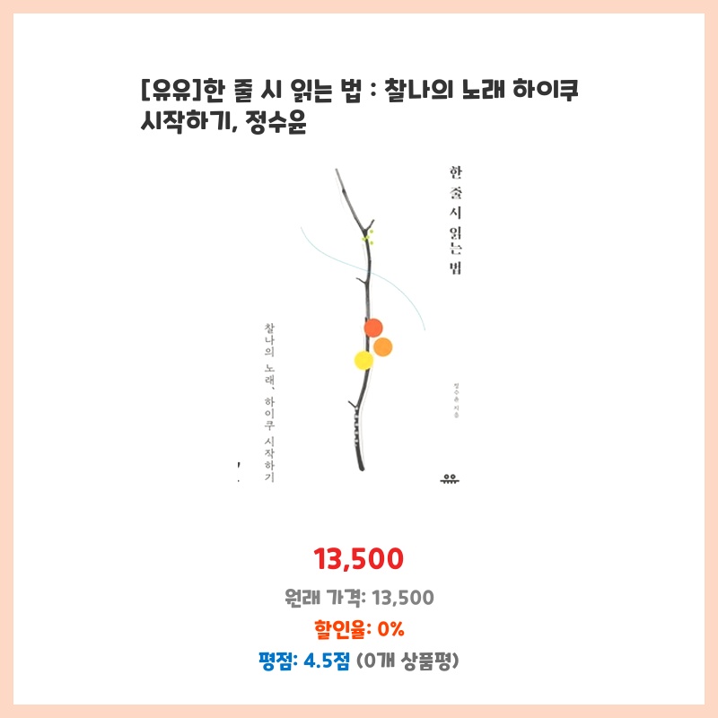 하이쿠에 관심이 생겨 입문서를 찾던 중, 정수윤 작가의 책이 평이 좋아 구매했습니다. 하이쿠의 기본 원리와 실제 작법을 쉽게 설명해주는 점이 매력적이었습니다. 책의 구성도 체계적이고, 예시 작품들이 풍부해서 이해도가 높았습니다.