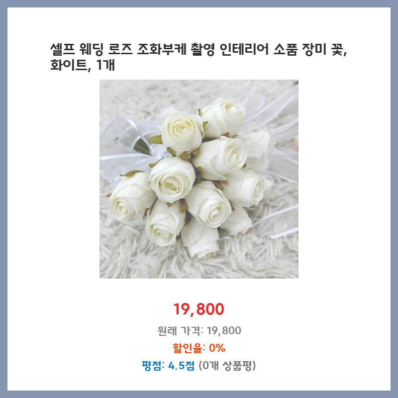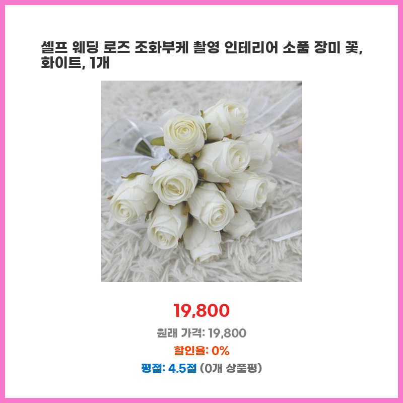 셀프 웨딩 촬영을 준비하며 부케가 필요했는데, 실제 꽃보다 관리가 편하고 가격도 부담 없어서 구매했습니다. 화이트 색상이 깨끗하고 사진에도 잘 나올 것 같아 만족스러워요. 인테리어 소품으로도 활용 가능한 점이 좋았습니다.