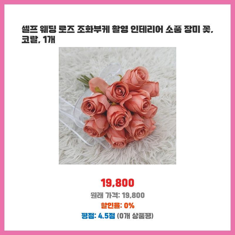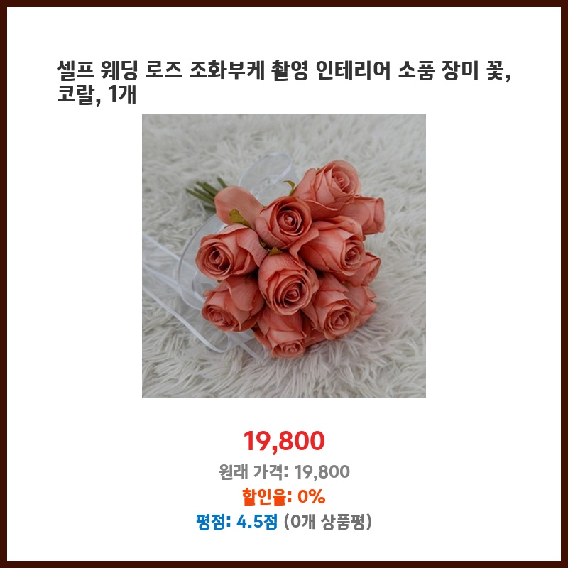 셀프 웨딩 촬영을 준비하며 부케가 필요했는데, 실제 꽃보다 관리가 편하고 가격 부담이 적어 구매했습니다. 코랄 색상이 예뻐서 사진에도 잘 어울릴 것 같았습니다. 조화라 오래 보관하며 인테리어 소품으로도 활용 가능할 것 같아 만족스러웠습니다.