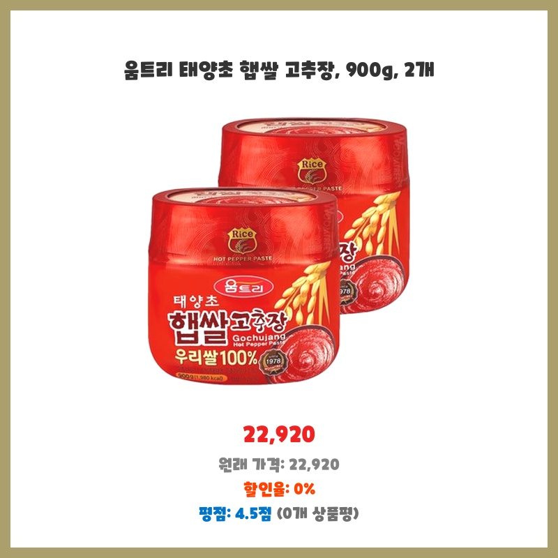 움트리 태양초 햅쌀 고추장, 900g, 2개