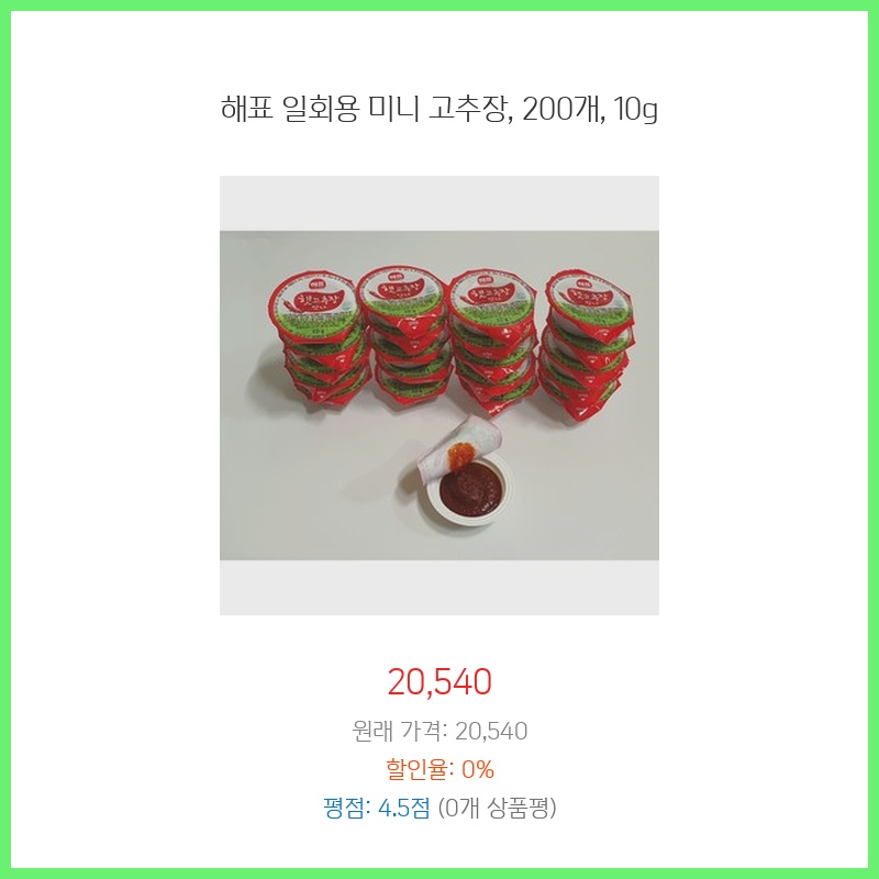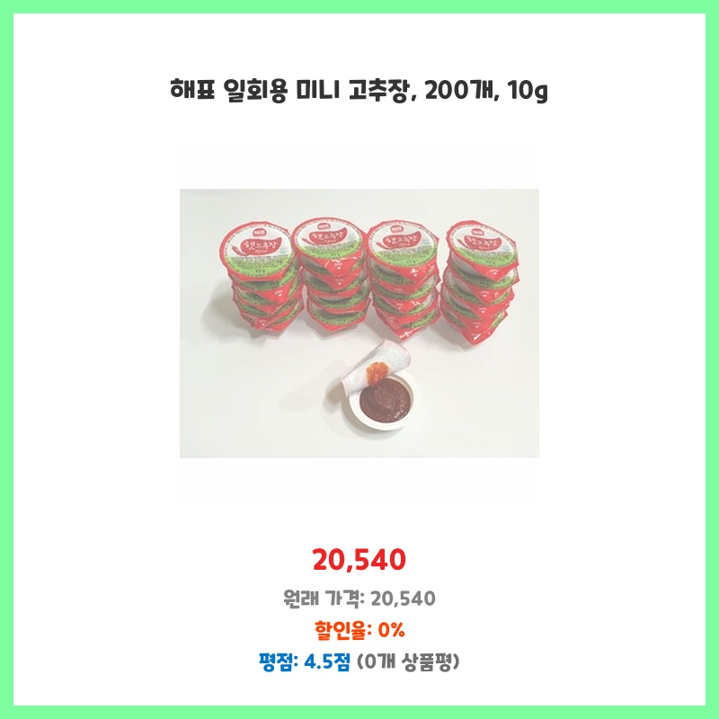 소규모 행사나 야외 활동 시 개별 포장된 고추장이 필요해서 구매했습니다. 10g 소포장이라 휴대성이 좋고, 위생적이며, 낭비 없이 사용할 수 있어 편리합니다. 200개 대용량이라 가성비도 좋습니다.