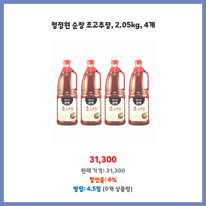 가족이 많아 초고추장 소비량이 많아 대용량 제품을 찾던 중, 믿을 수 있는 청정원 브랜드의 순창 초고추장을 발견했습니다. 4개들이라 오래 두고 먹을 수 있고, 가격 대비 용량이 커 경제적입니다.