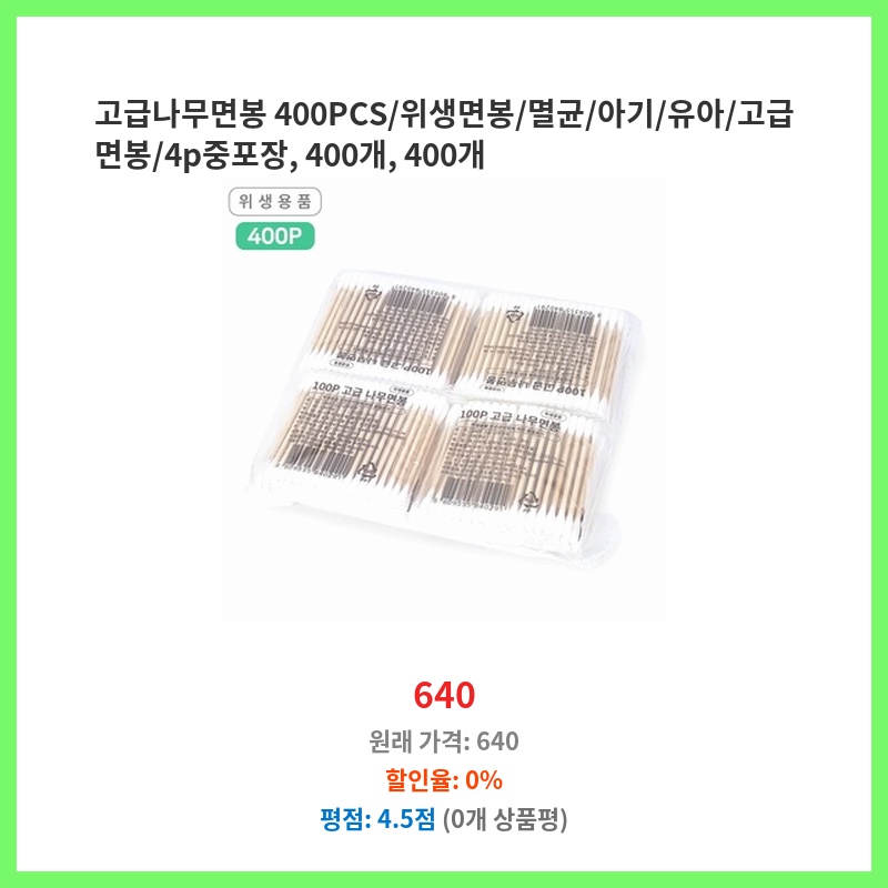 고급나무면봉 400PCS/위생면봉/멸균/아기/유아/고급면봉/4p중포장, 400개, 400개