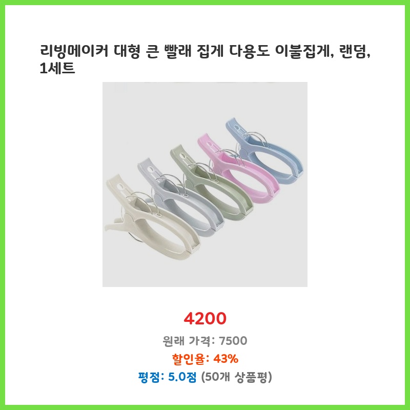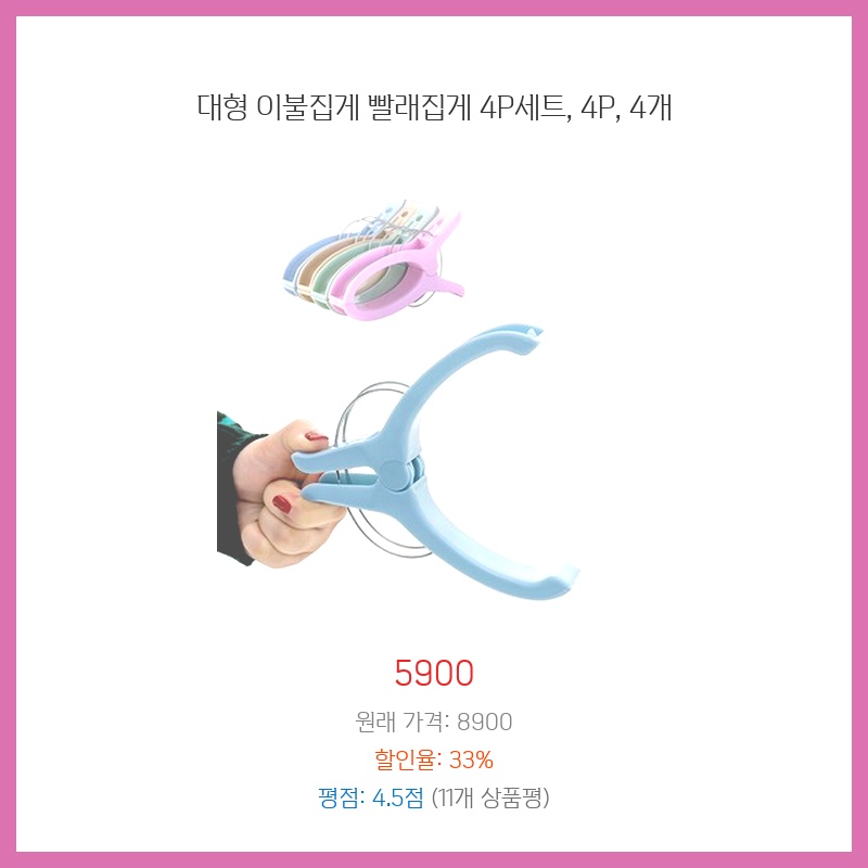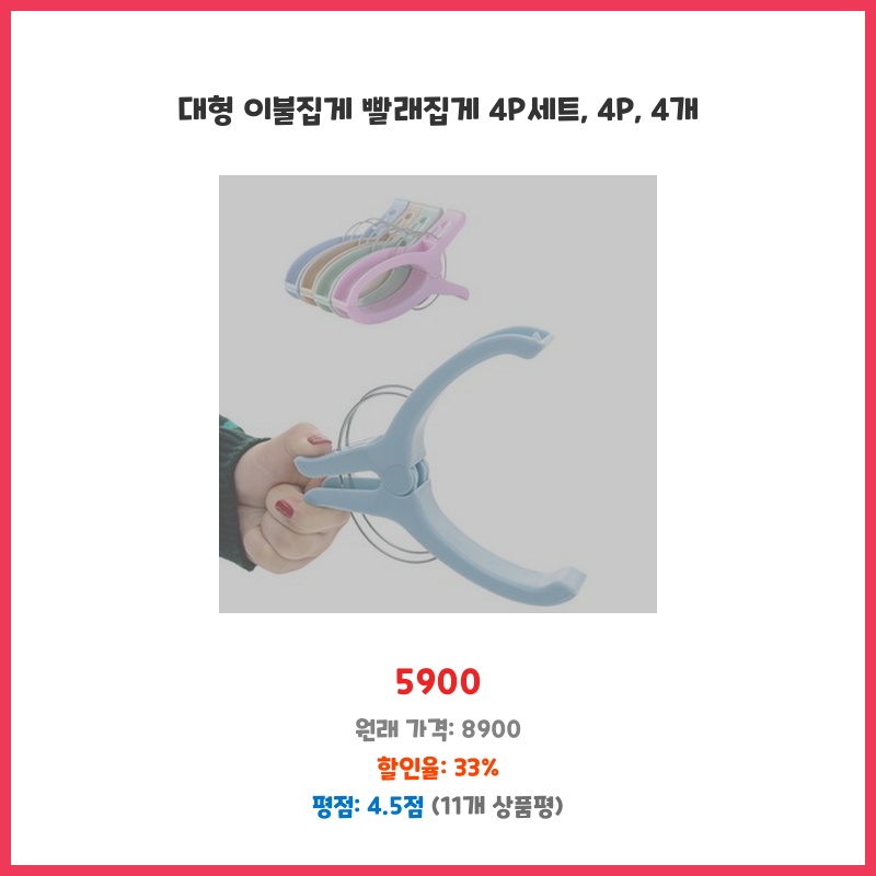 이불이나 빨랫감을 널 때 작은 집게로는 불편했는데, 대형 사이즈라 여러 장을 한 번에 고정하기 편리할 것 같아 구매했습니다. 다용도로 사용 가능하다는 점도 매력적이었습니다. 가격도 부담스럽지 않았습니다.