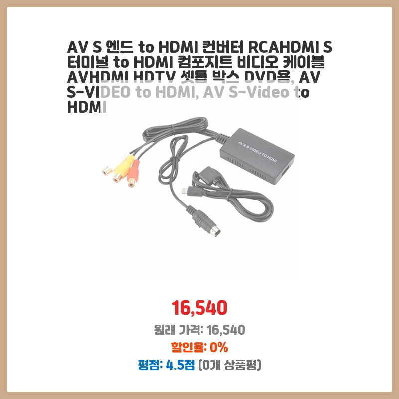 옛날 캠코더의 AV 또는 S-Video 영상을 최신 TV에서 시청하고 싶어 구매했습니다. HDMI 단자만 있는 TV에 연결하여 추억이 담긴 영상을 볼 수 있게 되어 만족합니다. 설치도 간편했습니다.