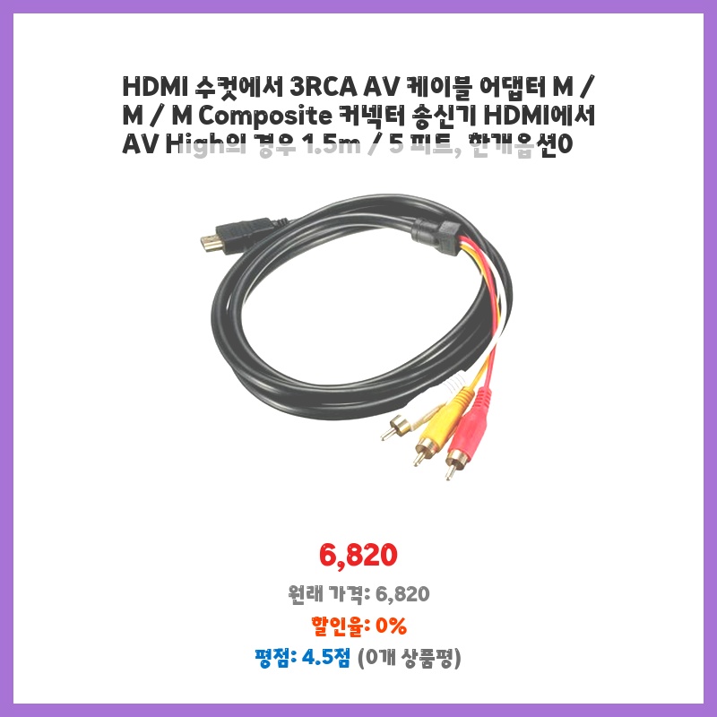 옛날 캠코더 영상을 TV에 연결해서 보고 싶었는데, HDMI 단자만 있는 최신 TV에 연결할 방법이 없어서 구매했습니다. HDMI를 AV로 변환해주니 편리하고, 1.5m 길이라 사용하기에도 불편함이 없었습니다. 가격도 적당했습니다.