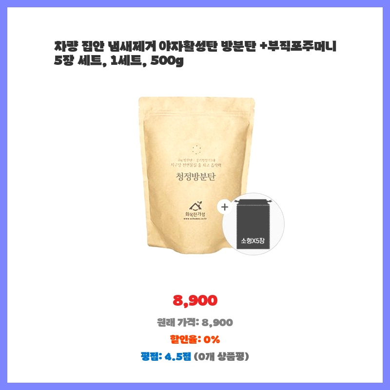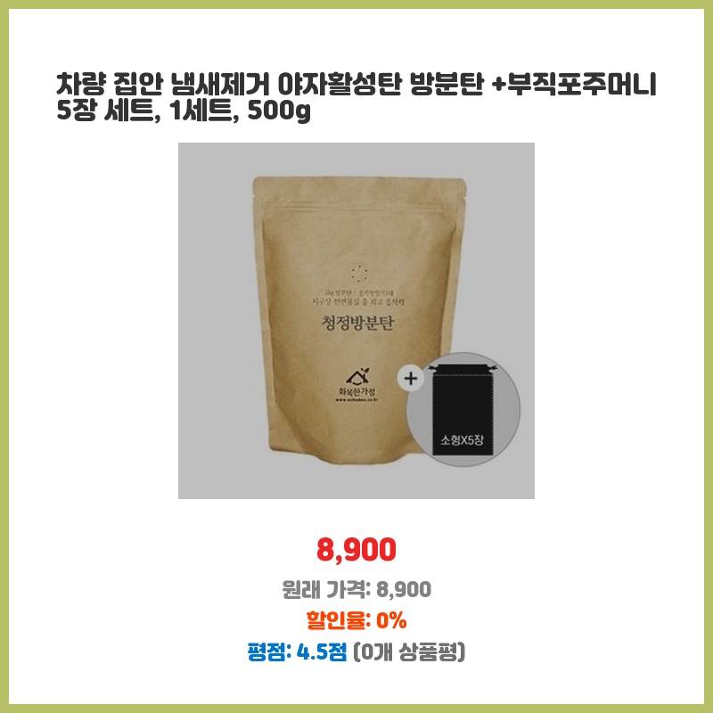차량 내 냄새 때문에 고민이었는데, 야자활성탄의 뛰어난 흡착력에 대한 후기를 보고 구매했습니다. 500g에 부직포 주머니까지 5개나 들어있어 가성비도 좋아 보였습니다. 자동차 뿐 아니라 집에서도 사용할 수 있다는 점도 매력적이었습니다.