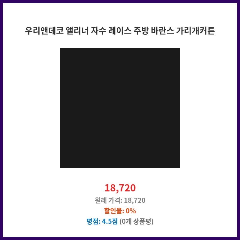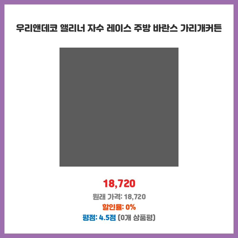 깔끔한 디자인과 고급스러운 자수 레이스가 마음에 들어 구매했습니다. 주방 분위기가 한층 더 화사해졌고, 기존의 칙칙했던 느낌을 개선해 만족스럽습니다. 적당한 길이감도 좋았습니다.