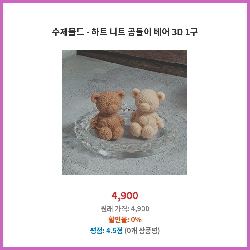 앙증맞은 니트 곰돌이 모양의 몰드가 마음에 들어 구매했습니다. 수제 비누나 캔들 만들기에 활용하면 귀여운 작품을 만들 수 있을 것 같아 기대됩니다. 1구라서 관리도 편리할 것 같습니다.
