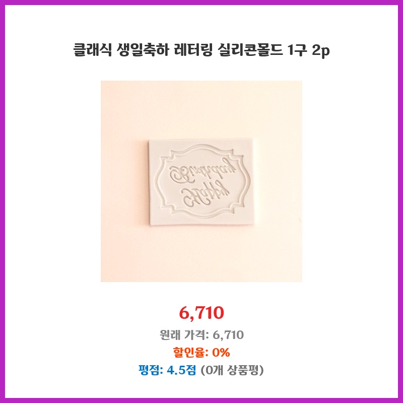 수제 꾸미기 번호판을 만들고 싶어서 실리콘 몰드를 찾던 중 가격 대비 괜찮은 제품이라 구매했습니다. 1구라 사용하기 편리하고, 랜덤 발송이지만 다양한 디자인을 기대할 수 있어 좋았습니다. 실리콘 재질이라 탈형도 수월할 것 같습니다.