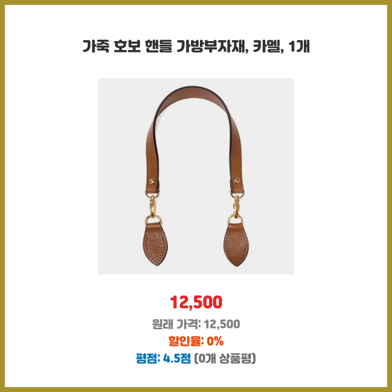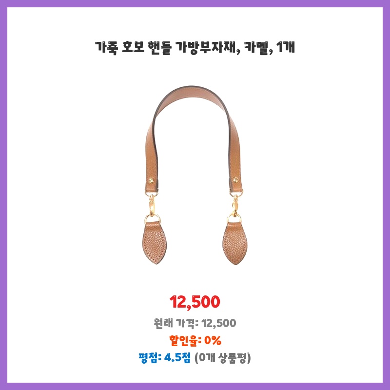 가방 제작에 필요한 부자재를 찾던 중, 깔끔한 카멜 색상의 가죽 호보 핸들 부자재가 눈에 띄었습니다. 가격도 적당하고, 1개만 구매 가능해서 필요한 만큼만 구입할 수 있어 좋았습니다. 품질도 괜찮아 보여서 선택했습니다.