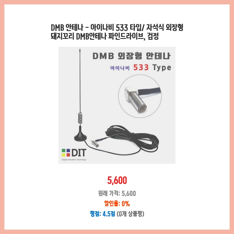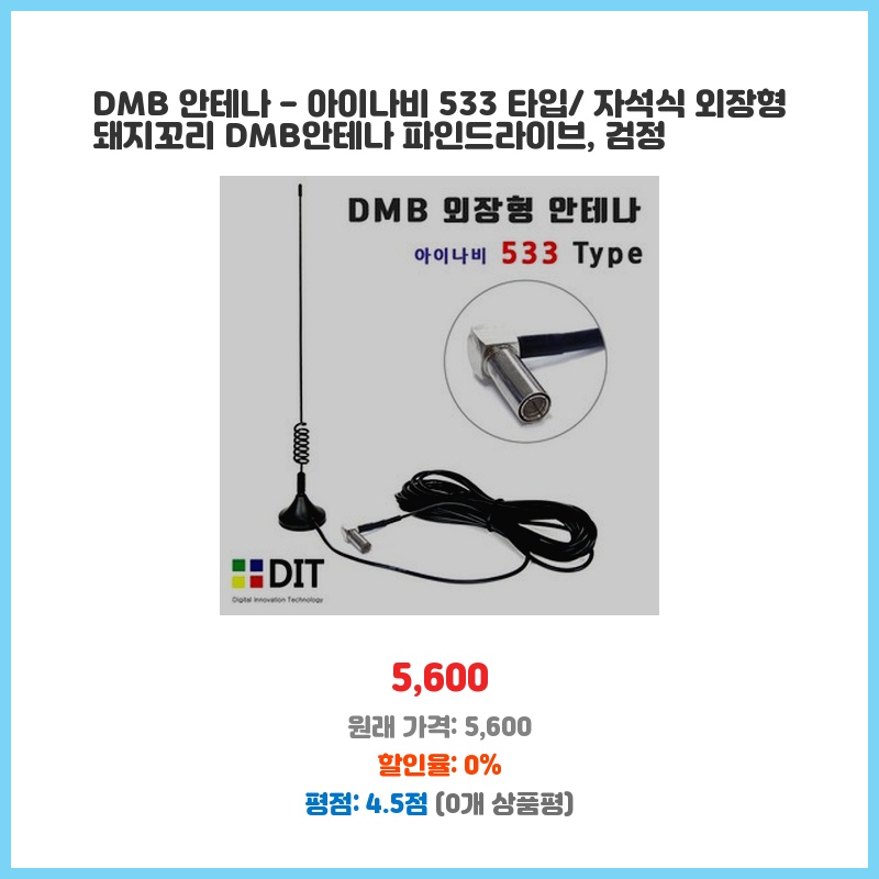 아이나비 533 네비게이션의 DMB 수신이 불안정해서 외장 안테나를 찾던 중, 자석식이라 부착이 간편하고 가격도 적당해서 구매했습니다. 돼지꼬리 안테나라 수신율도 기대됩니다. 기존 안테나보다 훨씬 나은 수신 상태를 기대하며 구매했습니다.