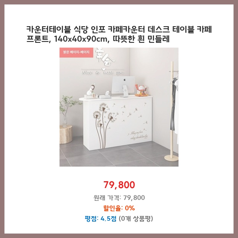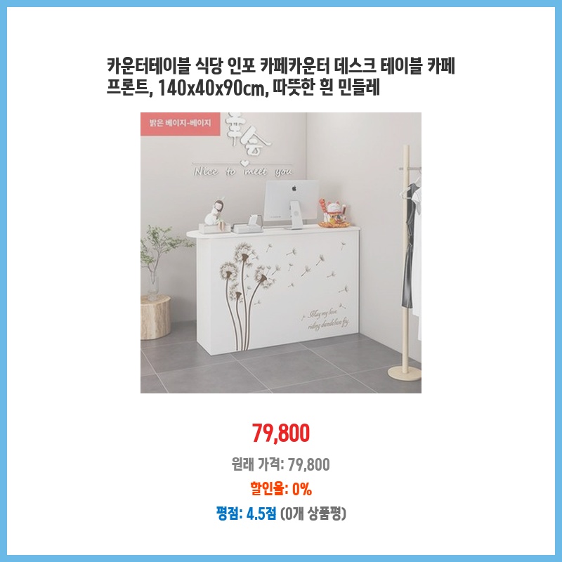 깔끔한 디자인과 적당한 크기(140x40x90cm)가 마음에 들었습니다. 카페 분위기 연출에 딱 맞는 따뜻한 흰 민들레 색상도 좋았고, 견고해 보이는 재질이 오래 사용할 수 있을 것 같아 구매했습니다. 가격 대비 만족스러운 품질입니다.
