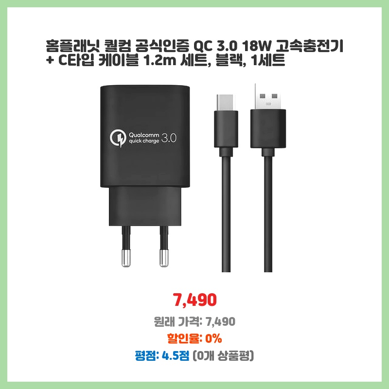 득템의 기회 홈플래닛 퀄컴 공식인증 QC 3.0 18W 고속충전기 + C타입 케이블 1.2m 세트 블랙 1세트 새로 들어온 제품