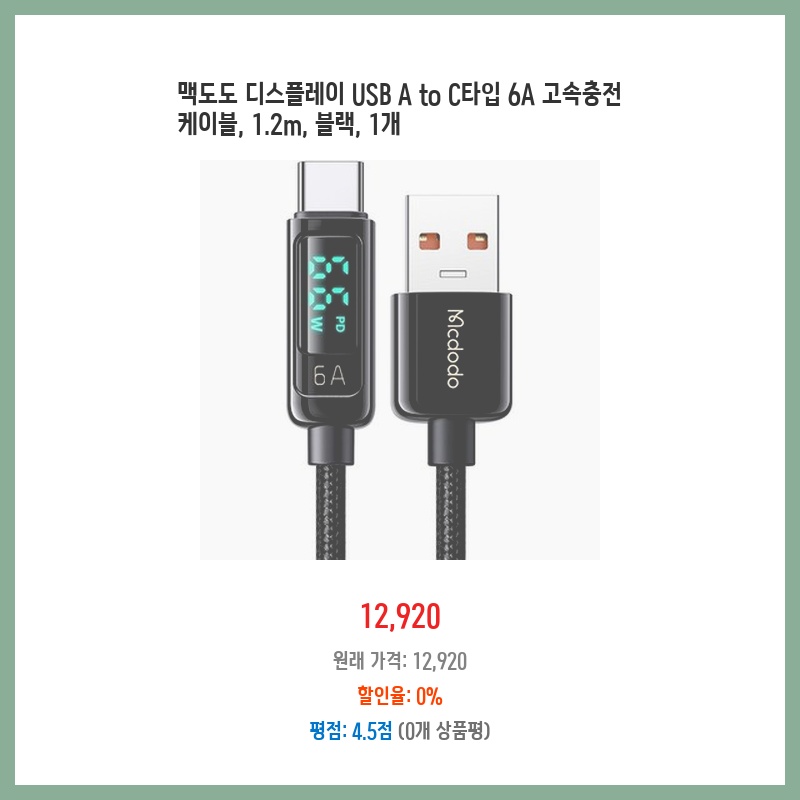 휴대폰과 태블릿 충전이 느려 불편했는데, 고속 충전을 지원하는 맥도도 케이블이 가격 대비 성능이 좋아 보여 구매했습니다. 1.2m 길이도 적당하고, 튼튼해 보이는 재질도 마음에 들었습니다. USB A타입과 C타입 모두 지원하는 점도 편리할 것 같아 선택했습니다.