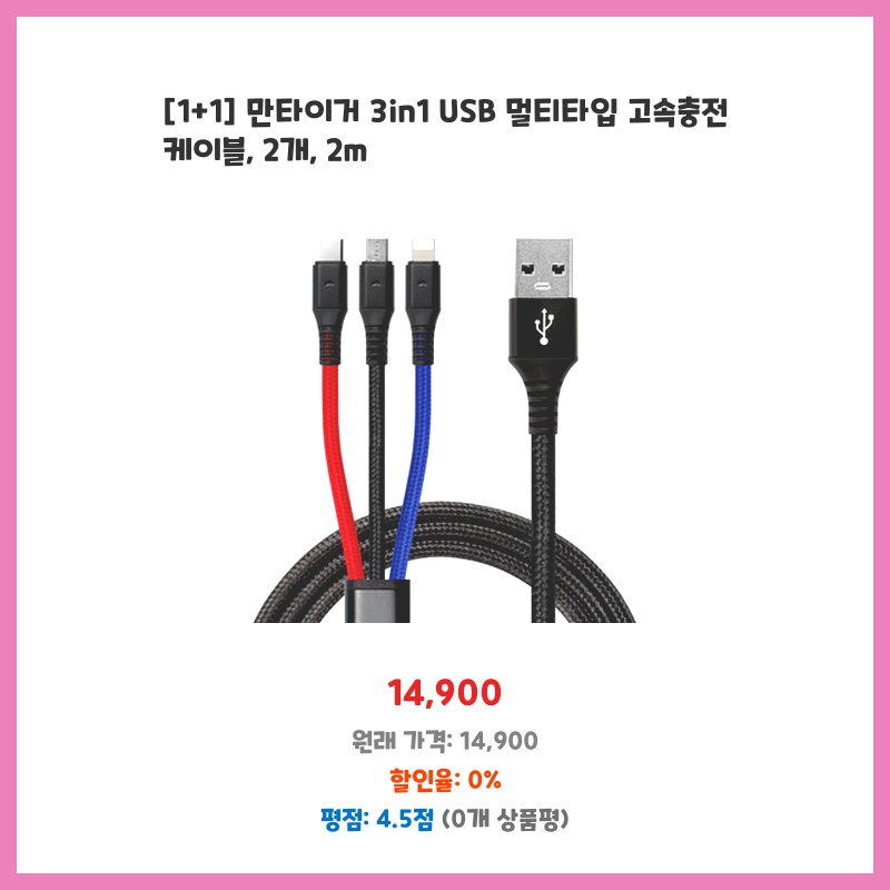 여러 기기를 충전하는데 정말 편리해요! 고속 충전도 잘 되고, 길이도 넉넉해서 좋습니다. 두 개나 있어서 하나는 집에, 하나는 회사에 두고 사용 중입니다.