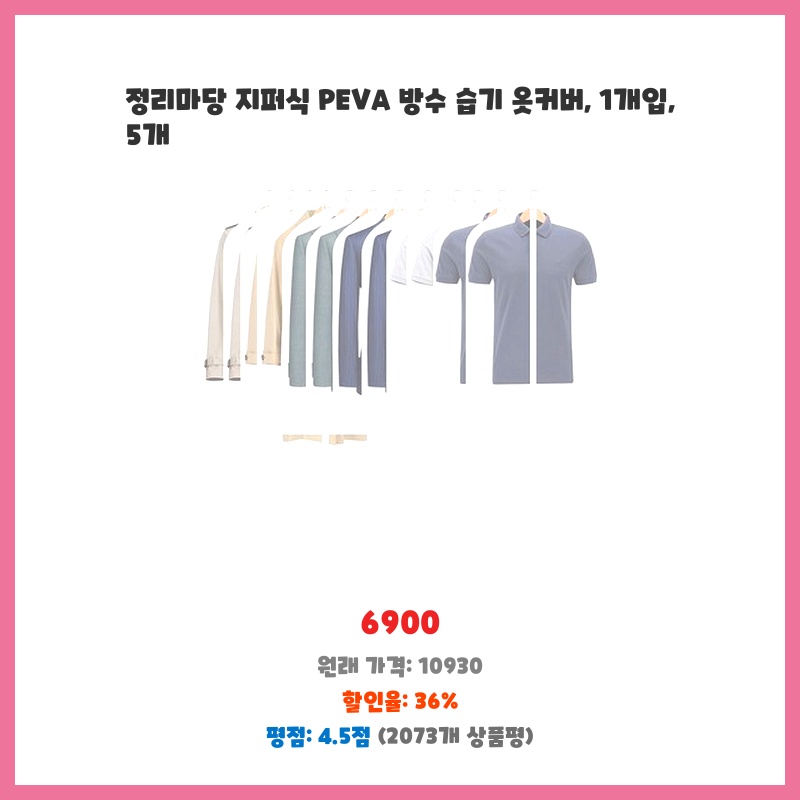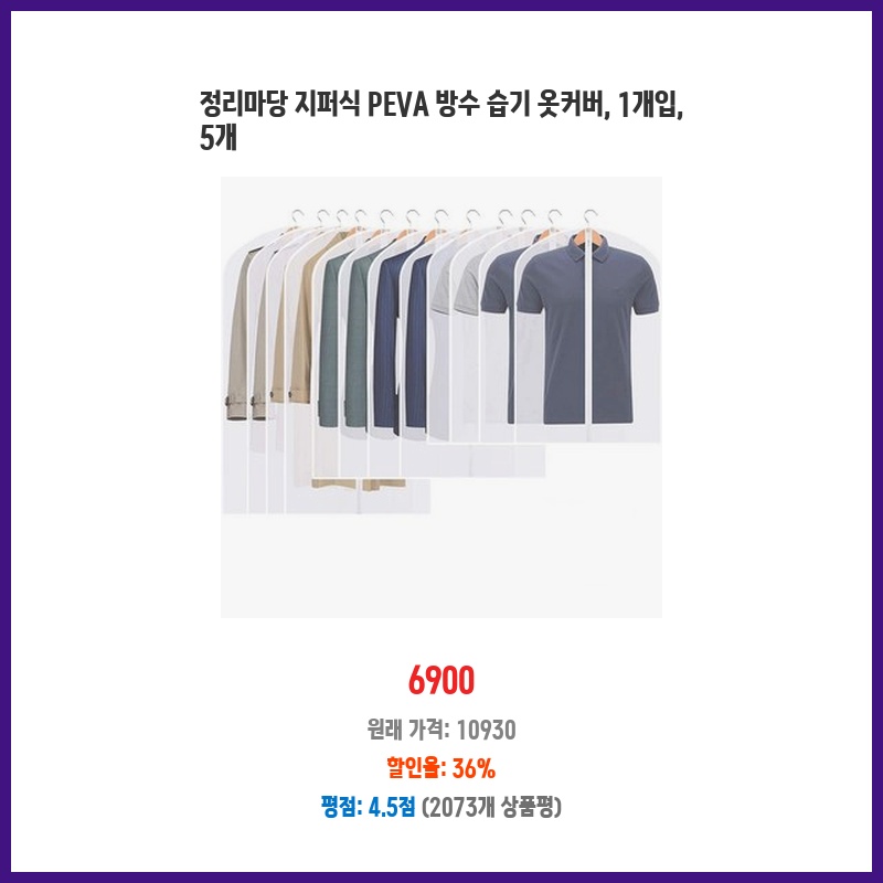 옷장 속 습기와 먼지 때문에 옷 관리가 힘들어서 구매했습니다. 지퍼형이라 옷 보관이 편리하고, PEVA 소재라 방수, 습기 차단 효과가 기대됩니다. 5개입이라 여러 옷을 정리하기에 좋을 것 같아요.
