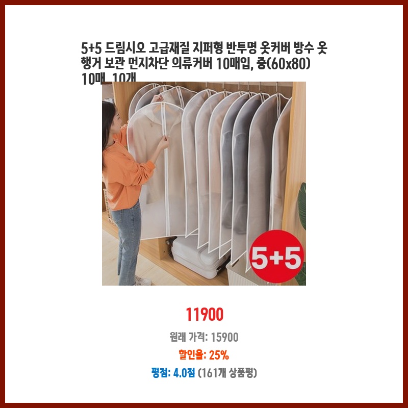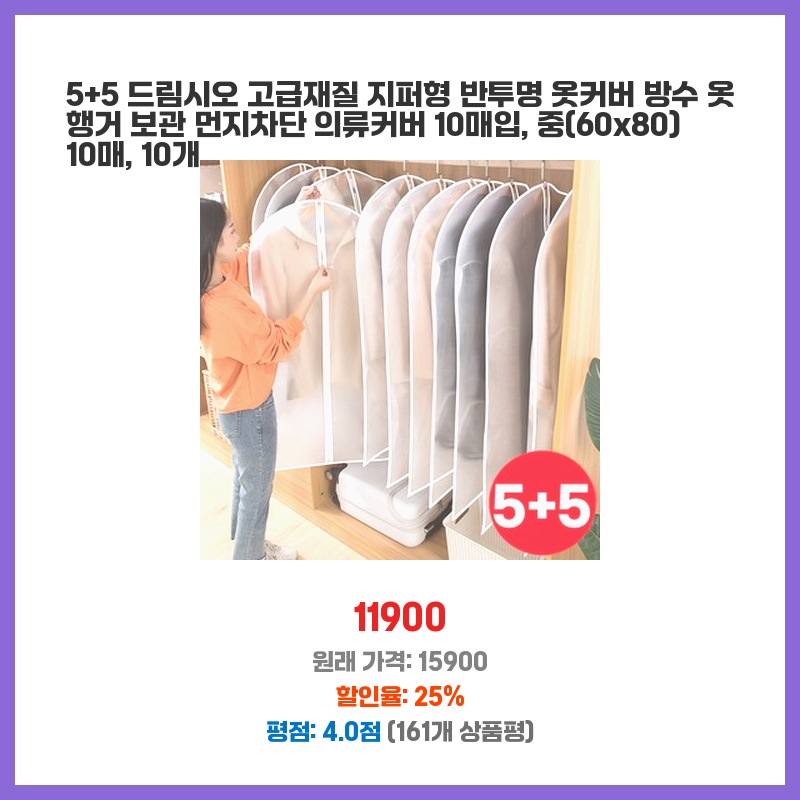 득템의 기회 5+5 드림시오 고급재질 지퍼형 반투명 옷커버 방수 옷 행거 보관 먼지차단 의류커버 10매입 중 10매 이 가격에 놓치면 후회
