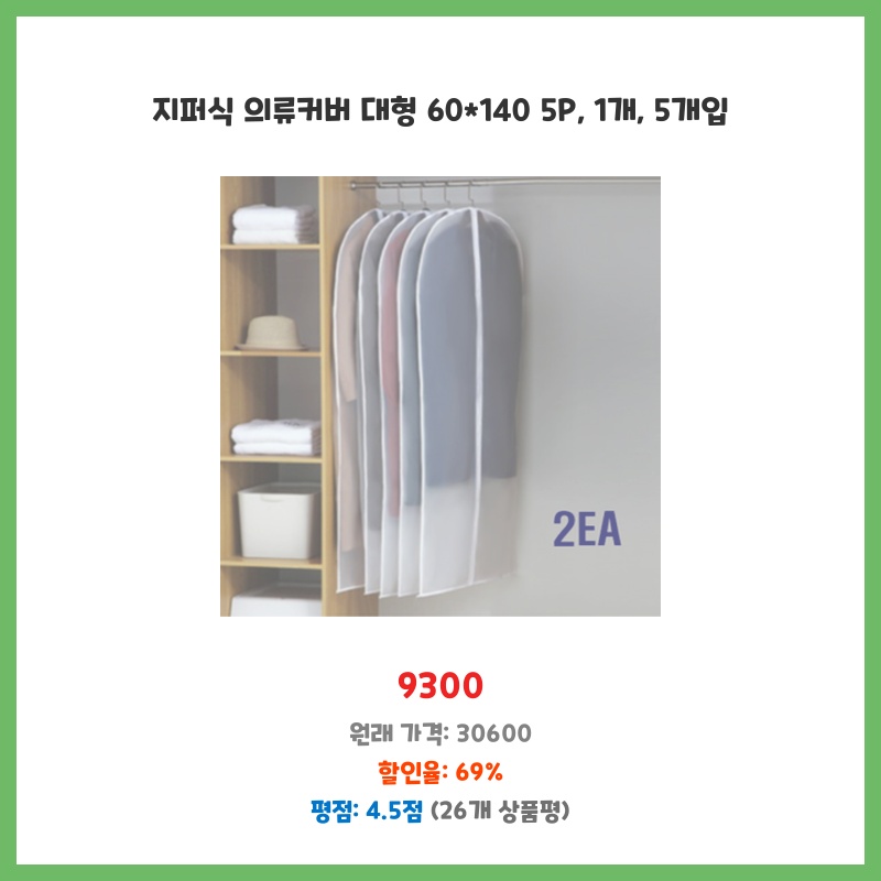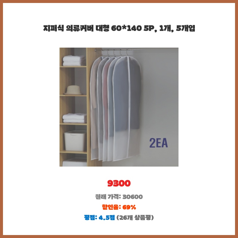 옷장이 좁아 옷 정리가 어려웠는데, 큰 사이즈의 의류커버 5개가 9300원이라는 저렴한 가격에 마음에 들었습니다. 지퍼형이라 먼지 유입도 막아주고, 옷 보관에 편리할 것 같아 구매했습니다. 넉넉한 사이즈로 두꺼운 겨울옷도 충분히 수납 가능할 것 같습니다.