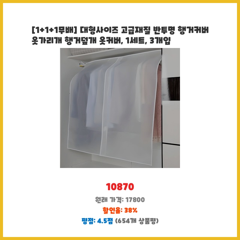 옷 정리가 필요했고, 먼지와 햇빛으로부터 옷을 보호할 수 있는 제품을 찾았습니다. 대형 사이즈에 3개나 들어있고 가격도 적당해서 구매했습니다. 고급 재질이라 오래 사용할 수 있을 것 같아 만족스럽습니다.