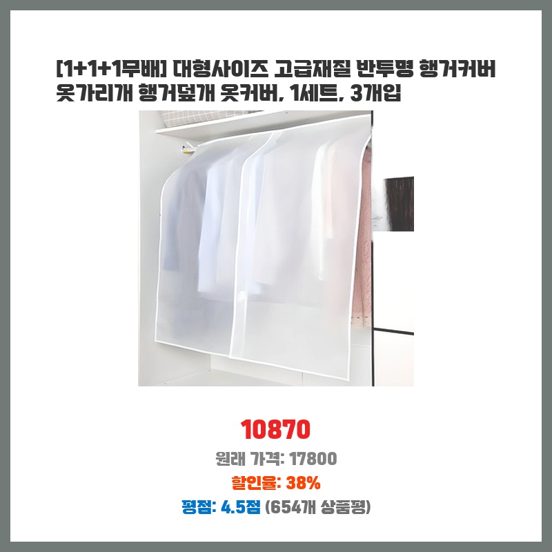 [1+1+1무배] 대형사이즈 고급재질 반투명 행거커버 옷가리개 행거덮개 옷커버, 1세트, 3개입