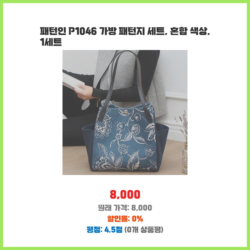 다양한 색상의 패턴지가 한 세트로 구성되어 있어 활용도가 높을 것 같아 구매했습니다. 가방 제작에 필요한 패턴지가 모두 포함되어 있어 편리할 것으로 예상됩니다. 합리적인 가격도 매력적입니다.