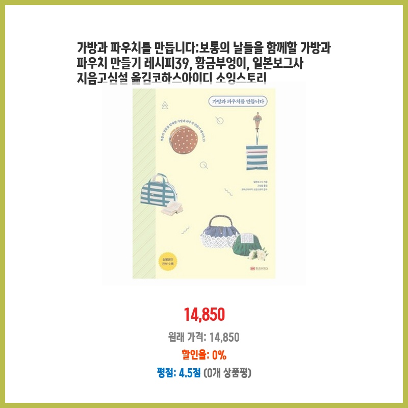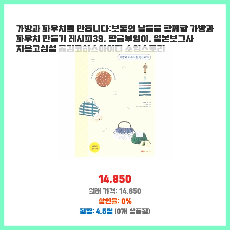 손바느질에 관심이 생겨 입문서를 찾던 중, 가방과 파우치를 만듭니다를 발견했습니다. 일본 보그사 출판으로 디자인과 패턴이 믿음직스러웠고, 다양한 가방과 파우치 제작 레시피가 포함되어 있어 구매했습니다. 실제 제작 과정 사진이 많아 초보자에게도 도움이 될 것 같았습니다.