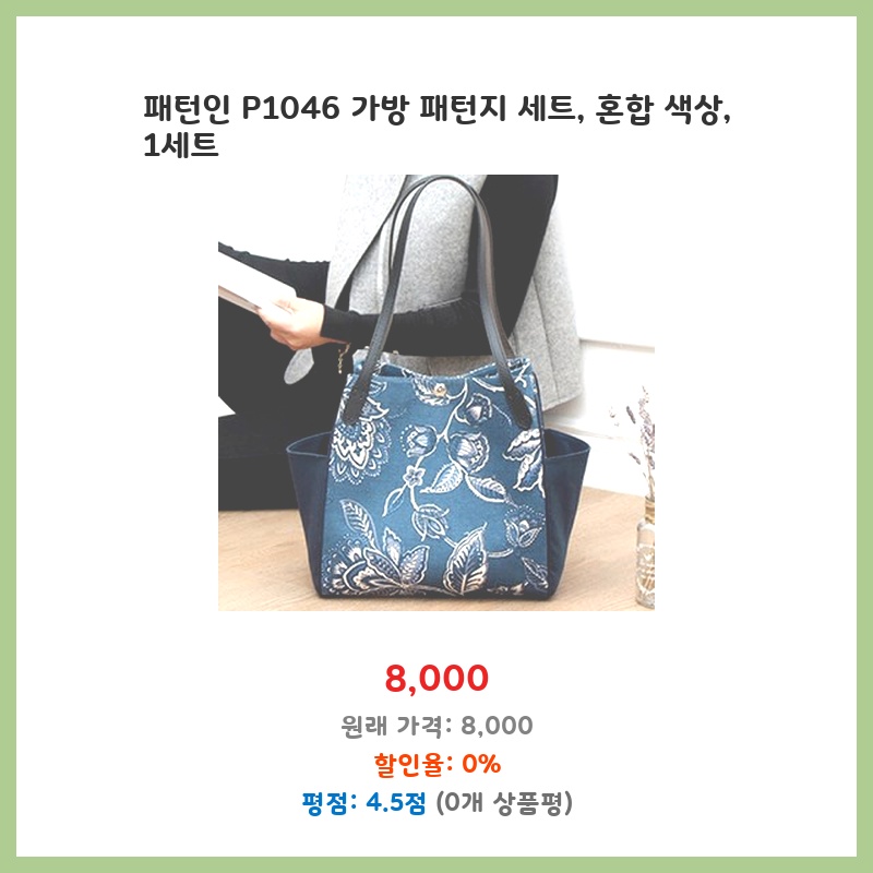 생각보다 패턴지 질이 좋았어요. 다양한 색상으로 여러 가방을 만들어 볼 수 있어 만족합니다. 설명서도 보기 쉬워서 초보자도 쉽게 사용 가능해요.