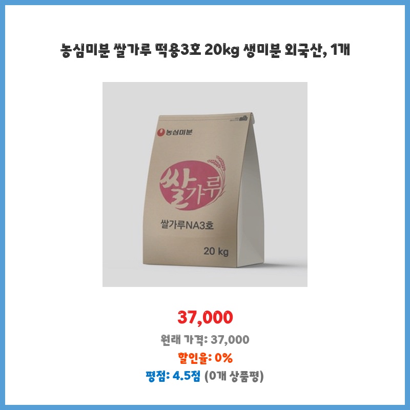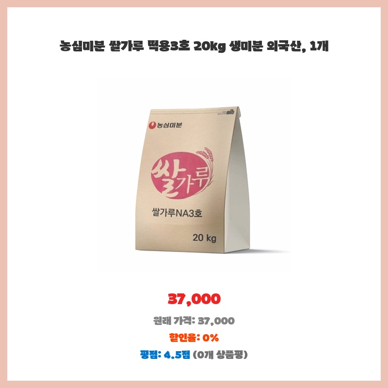 떡 제조를 위한 쌀가루가 필요했는데, 20kg 대용량에 가격도 합리적이어서 구매했습니다. 외국산이지만 품질에 대한 걱정 없이 떡을 만들 수 있을 것 같아 선택했습니다. 떡집 운영에 필요한 양을 충분히 확보할 수 있습니다.