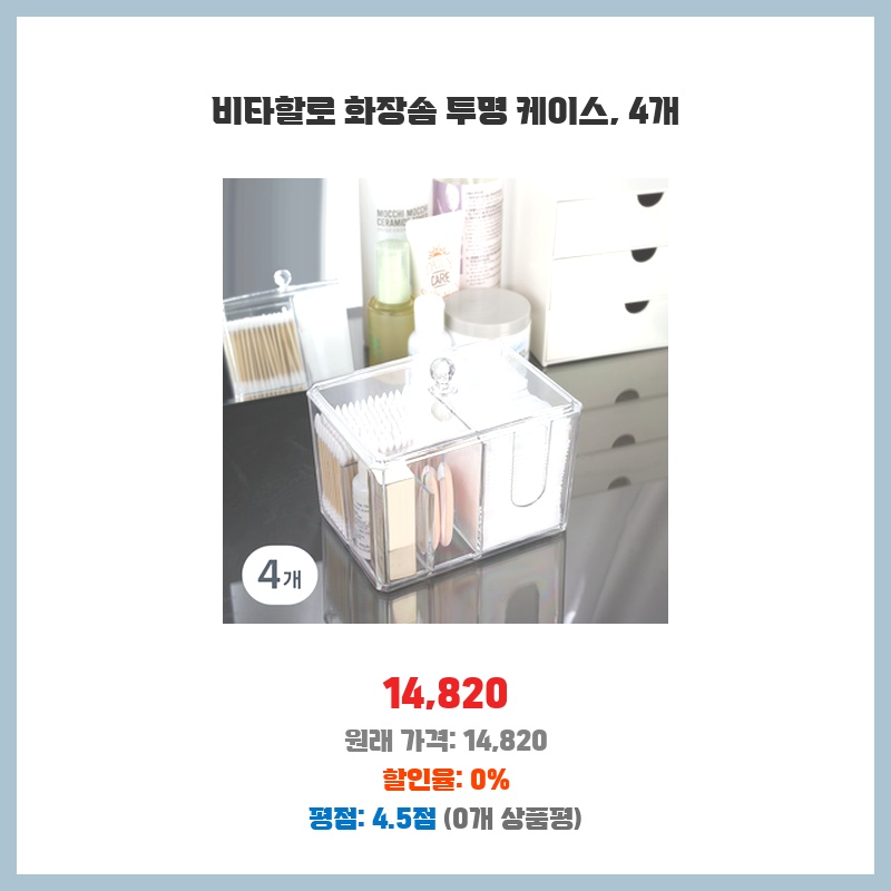 화장솜이 넉넉하고 투명 케이스라 사용량 확인이 편리해서 구매했습니다. 4개 세트라 가성비도 좋고, 일반 화장솜보다 두꺼워서 흡수력이 좋을 것 같아 기대됩니다. 깔끔한 디자인도 마음에 들었습니다.