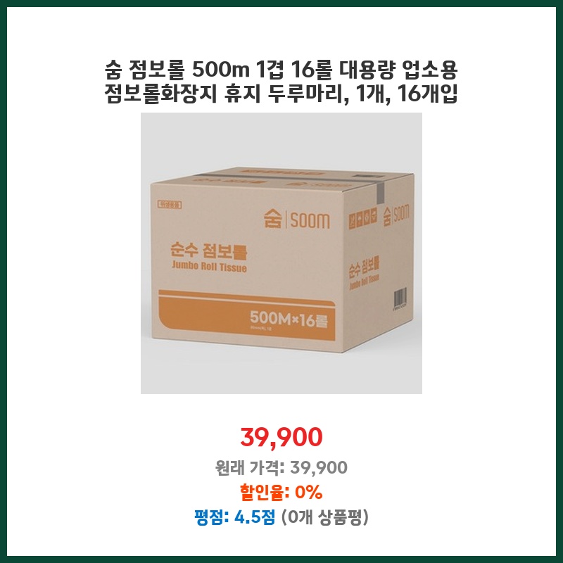 업소용으로 넉넉한 500m 점보롤 16개라 한 번 구매로 오래 쓸 수 있어 경제적입니다. 1겹이지만 생각보다 튼튼하고, 부드러워서 사용감도 좋습니다. 대용량이라 보관 공간은 필요하지만, 자주 교체하지 않아도 되는 편리함이 좋습니다.