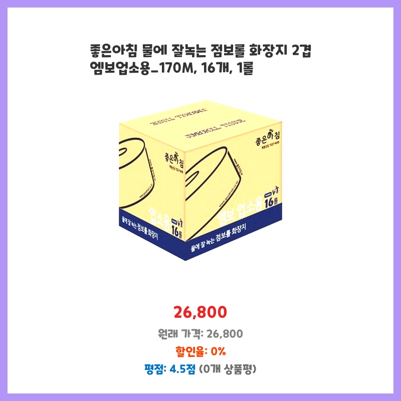 업소용으로 넉넉한 170m 길이에 2겹 엠보싱 처리라 부드럽고 흡수력도 좋아서 선택했습니다. 물에 잘 녹는다는 점도 위생적인 면에서 마음에 들었고, 16롤 대량 구매라 경제적입니다. 가격 대비 양이 많아서 좋습니다.