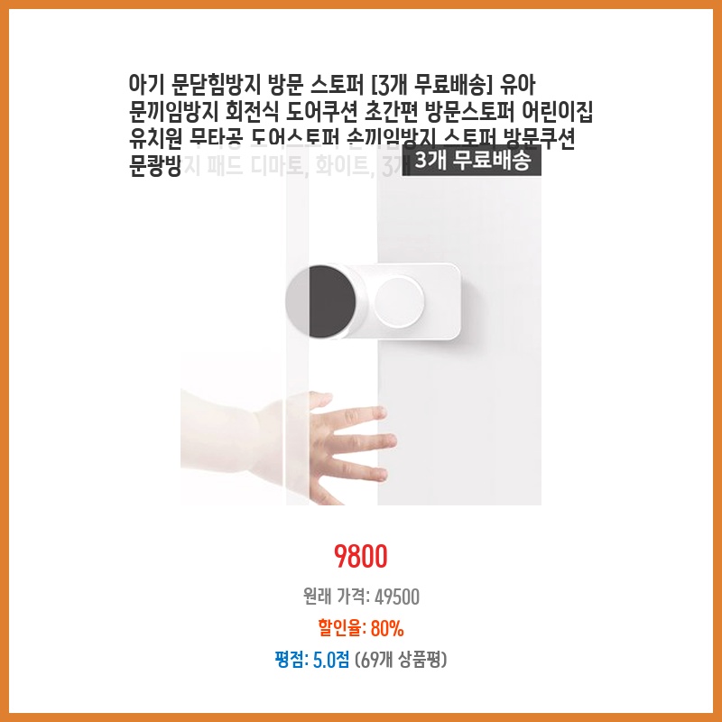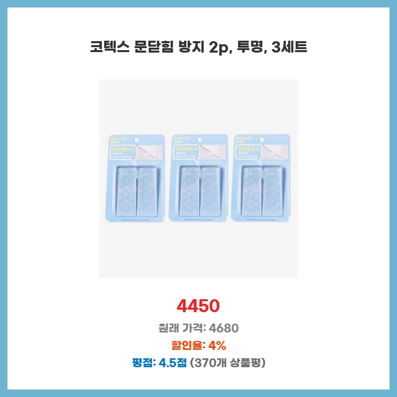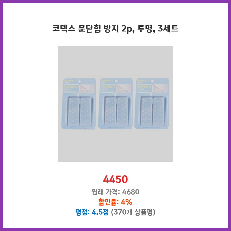 아이들이 문에 손가락을 자주 끼어서 걱정이었는데, 투명하고 깔끔한 디자인에 안전하게 문 닫힘을 방지해주는 제품이라 구매했습니다. 3세트라 여러 문에 설치할 수 있어서 좋았습니다. 설치도 간편했습니다.