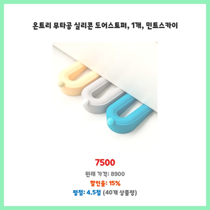 문 손잡이에 흠집 없이 문을 고정하고 싶어서 구매했습니다. 무타공이라 설치가 간편하고, 실리콘 소재라 문에 흠집이 나지 않아 좋습니다. 민트스카이 색상도 예뻐서 만족스럽습니다.
