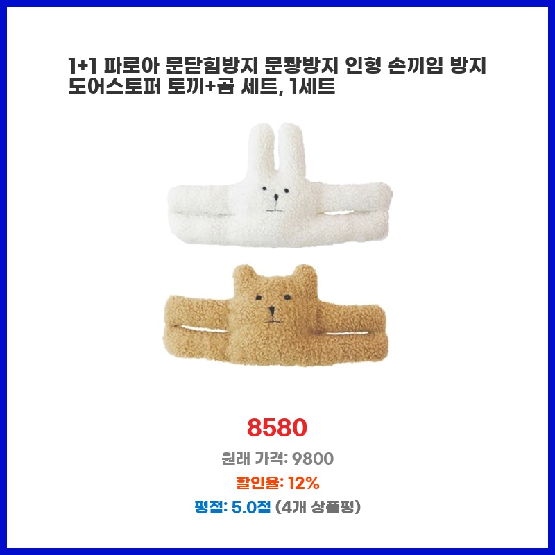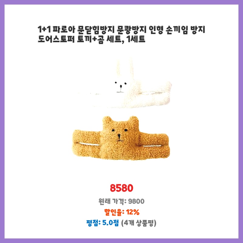 아이가 문에 손을 끼는 사고를 방지하고 싶어서 구매했습니다. 귀여운 토끼와 곰 디자인도 마음에 들고, 문을 부드럽게 막아주는 기능도 만족스러워요. 두 개 세트라서 여러 문에 사용할 수 있는 점도 좋습니다.