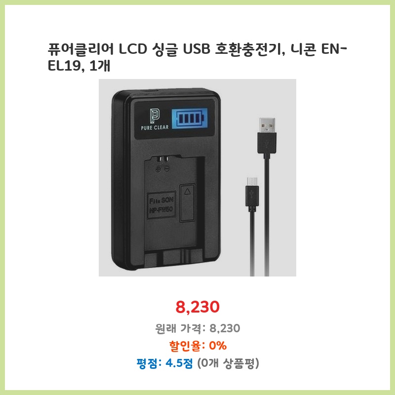 퓨어클리어 LCD 싱글 USB 호환충전기, 니콘 EN-EL19, 1개