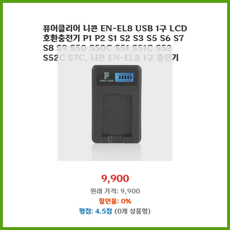 퓨어클리어 니콘 EN-EL8 USB 1구 LCD 호환충전기 P1 P2 S1 S2 S3 S5 S6 S7 S8 S9 S50 S50C S51 S51C S52 S52C S7C, 니콘 EN-EL8 1구 충전기