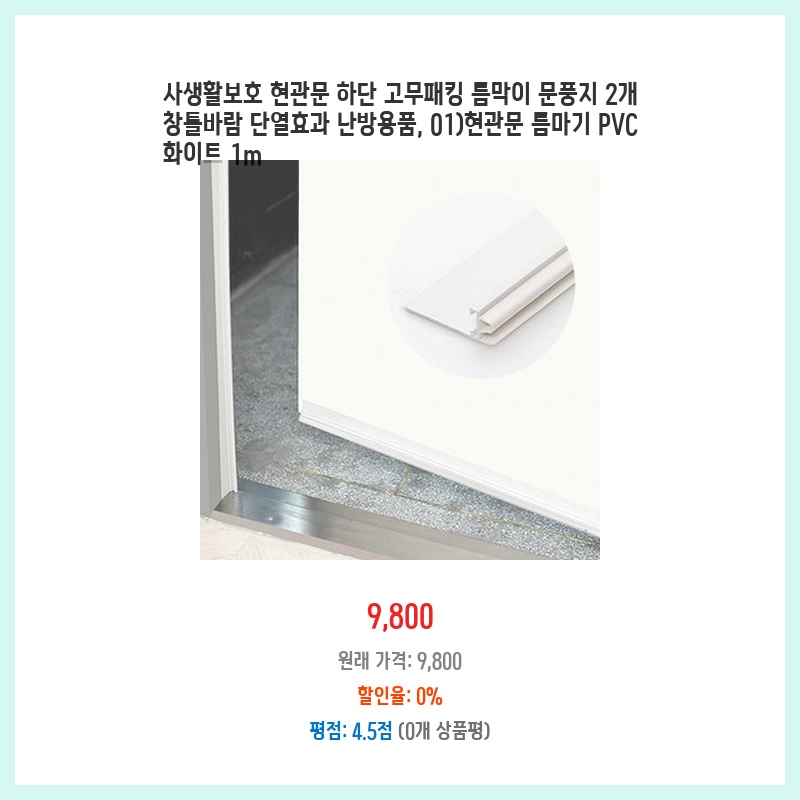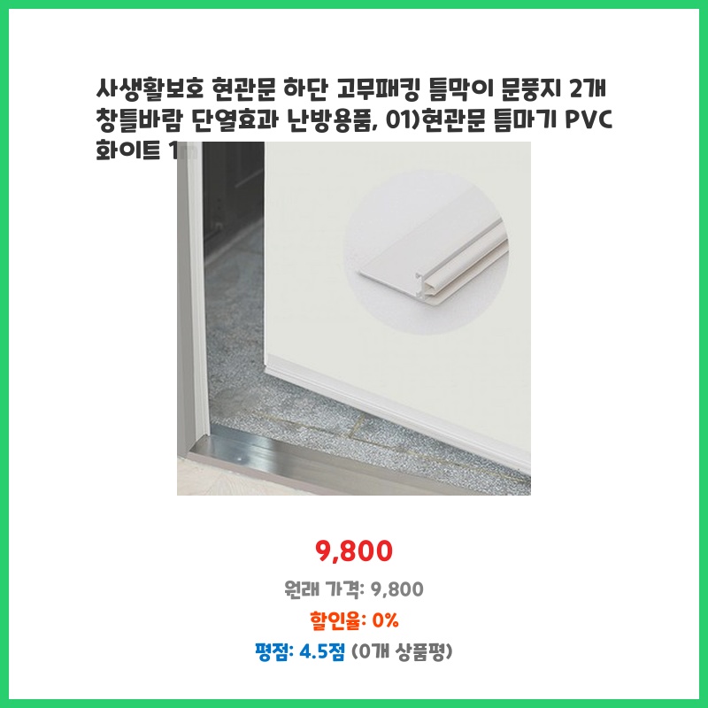 겨울철 현관문 틈새 바람 때문에 난방비가 많이 나가서 고민이었는데, 이 제품으로 틈을 효과적으로 막아줄 수 있을 것 같아 구매했습니다. PVC 재질이라 깔끔하고, 1m 길이라 현관문 하단 전체에 사용하기에 적절해 보였습니다.