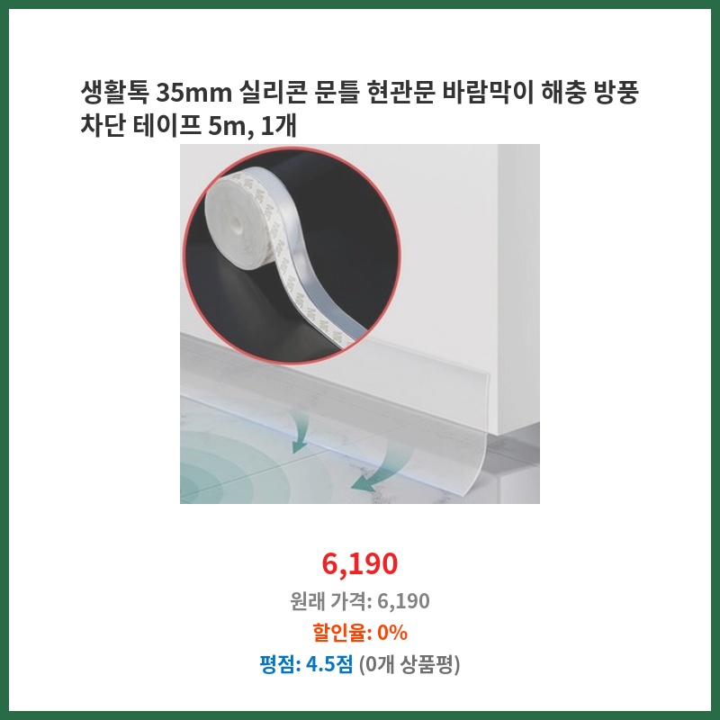 겨울철 찬바람과 여름철 해충 유입이 심해 문틈 막이가 필요했어요. 실리콘 소재라 깔끔하고, 35mm 두께로 문틈을 효과적으로 채워줄 것 같아 구매했습니다. 5m면 여러 문에 사용 가능해서 경제적이기도 하고요.