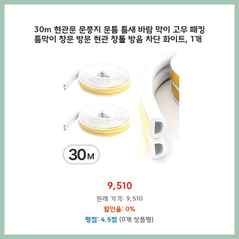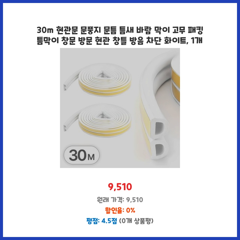 겨울철 찬바람이 심하게 들어와 난방비가 많이 나가서 고민이었는데, 문틈 틈새를 효과적으로 막아줄 제품을 찾다가 30m 길이의 넉넉한 길이와 깔끔한 화이트 색상에 끌려 구매했습니다. 설치도 간편하고 가격 대비 만족스러울 것 같아 기대됩니다.