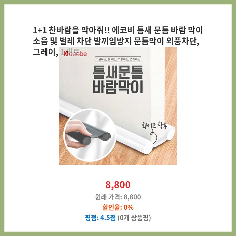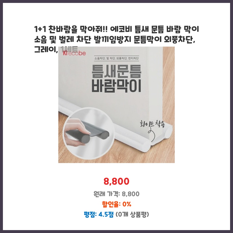 겨울철 문틈으로 새어 들어오는 찬바람 때문에 난방비가 많이 나가서 고민이었는데, 1+1에 가격도 저렴하고 에코비 문틈막이가 틈새 차단에 효과적이라는 후기를 보고 구매했습니다. 소음과 벌레 차단 효과도 기대됩니다.
