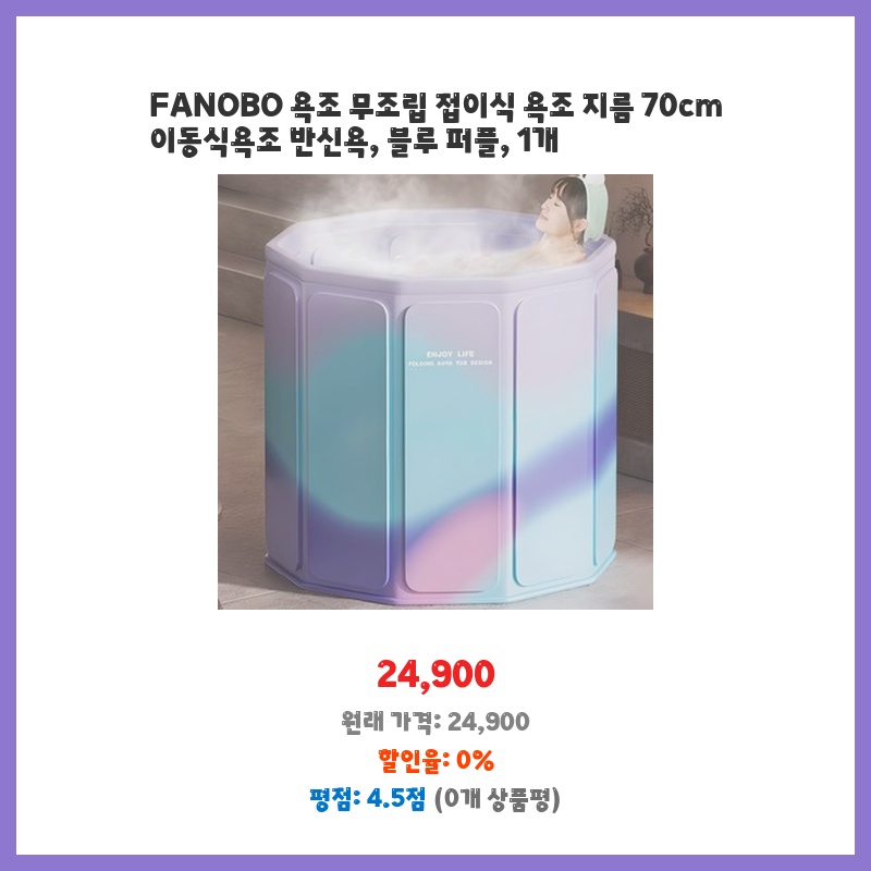 좁은 욕실에도 부담없이 설치 가능하고, 접었다 폈다 할 수 있어서 공간 활용도가 높아 보여 구매했습니다. 반신욕을 즐기기에 적당한 크기이고, 이동식이라 편리할 것 같았습니다. 가격도 부담스럽지 않아 좋았습니다.