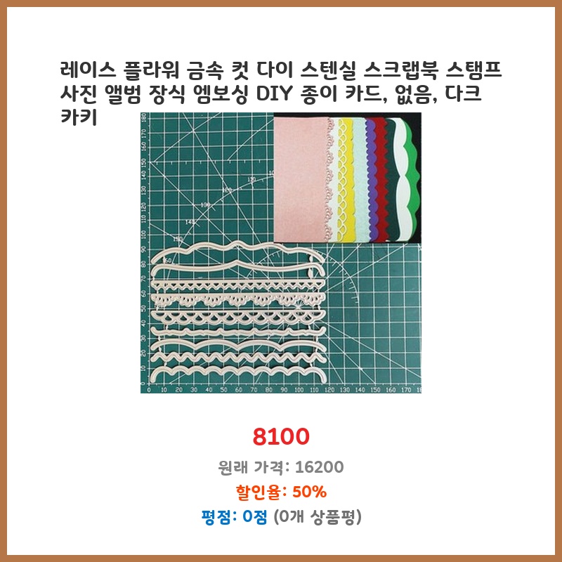 섬세한 레이스 플라워 디자인이 마음에 들어 구매했습니다. 금속 재질이라 여러 번 사용해도 견고하고, 스크랩북이나 카드 제작에 유용할 것 같아요. 다크 카키 색상도 고급스러워 보입니다. 다양한 엠보싱 효과를 낼 수 있다는 점도 매력적이었습니다.